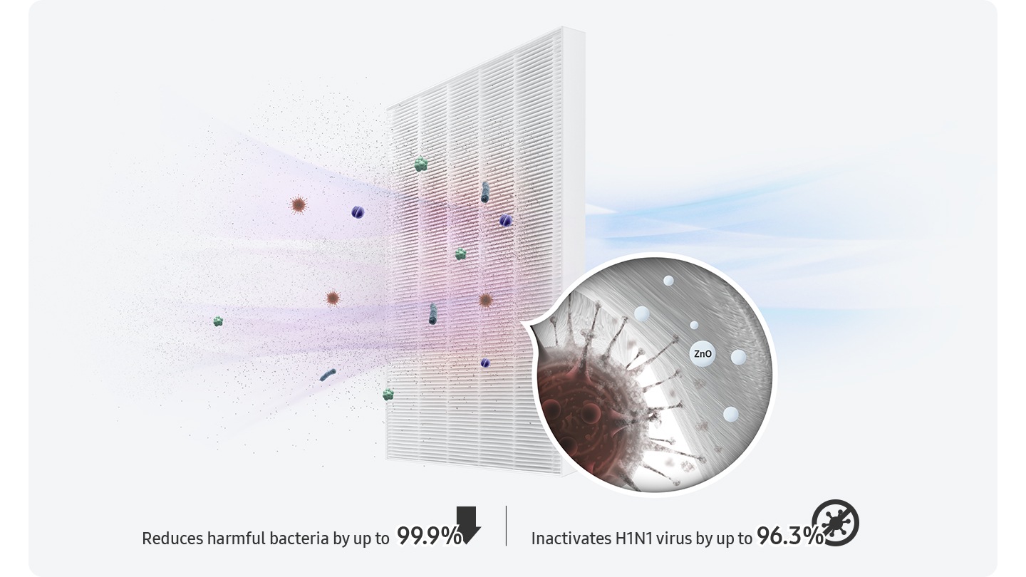 Màng lọc bụi siêu mịn kháng khuẩn có chứa oxit kẽm. Bảo vệ bạn và gia đình khỏi vi khuẩn và vi rút có hại, giúp loại bỏ vi khuẩn hiệu quả đến 99.9%* và vô hiệu hóa đến 96.3% vi rút H1N1 trên bề mặt của bộ lọc**.