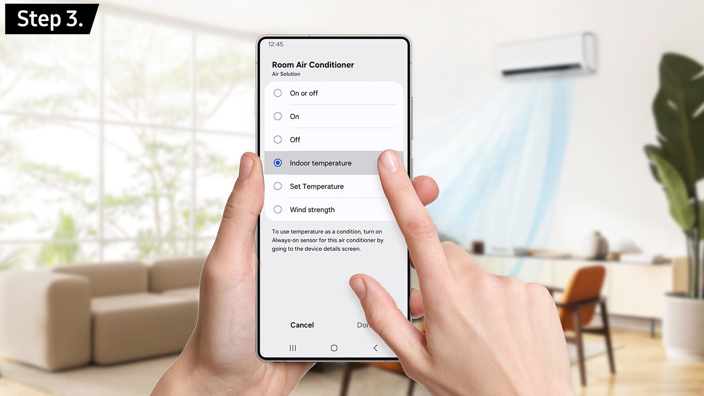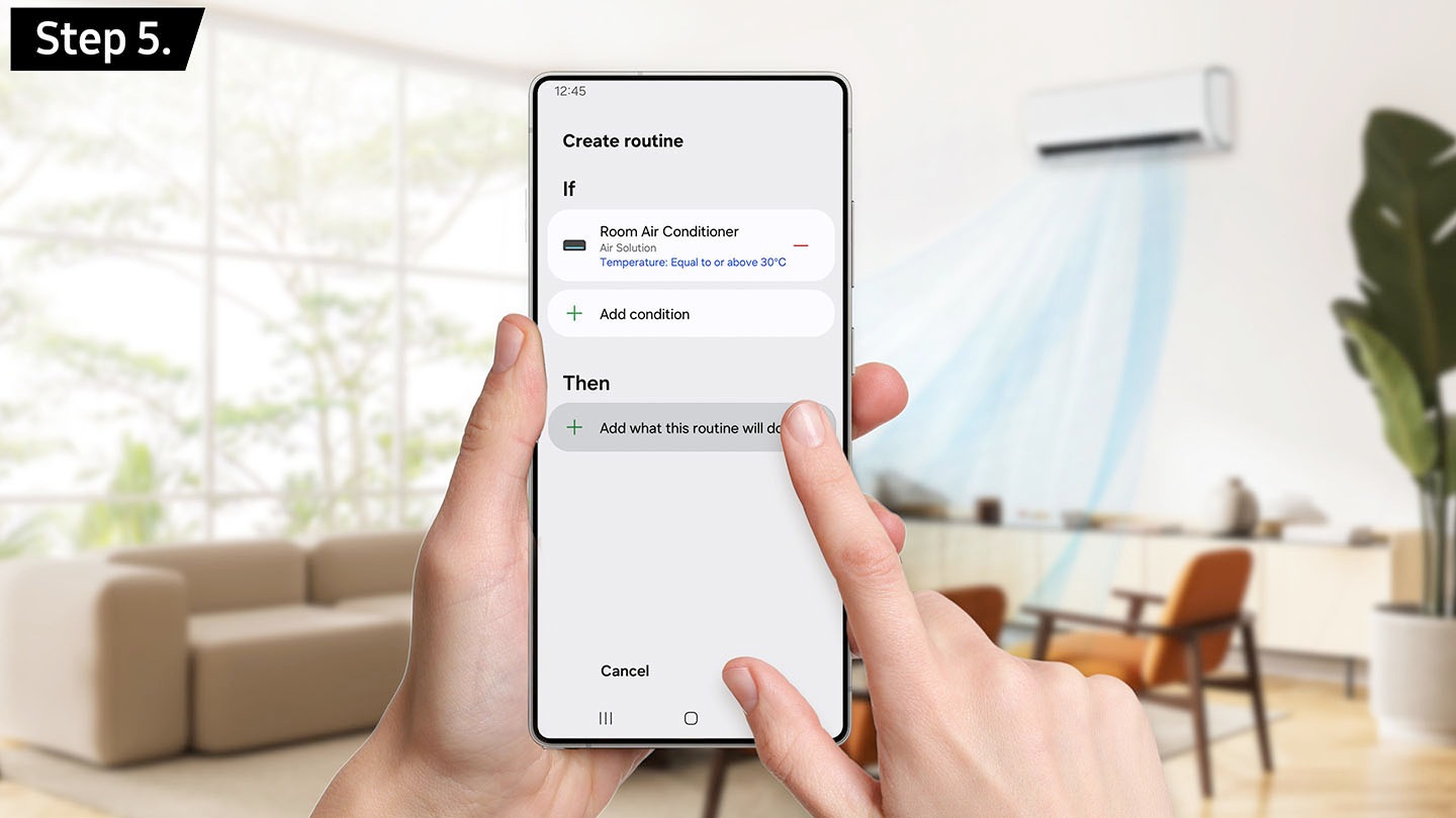 Luôn cảm thấy thoải mái với các thói quen được cá nhân hóa. Thay vì tự bật điều hòa mỗi lần, chỉ cần thiết lập Routine để SmartThings ghi nhớ. Khi nhiệt độ phòng vượt quá mức đã cài đặt (ví dụ: 30℃), điều hòa sẽ tự động khởi động. Không căng thẳng, không cần thao tác. Và điều tuyệt vời nhất? Bạn có thể thiết lập nhiều loại* thói quen phù hợp với lối sống của mình.
