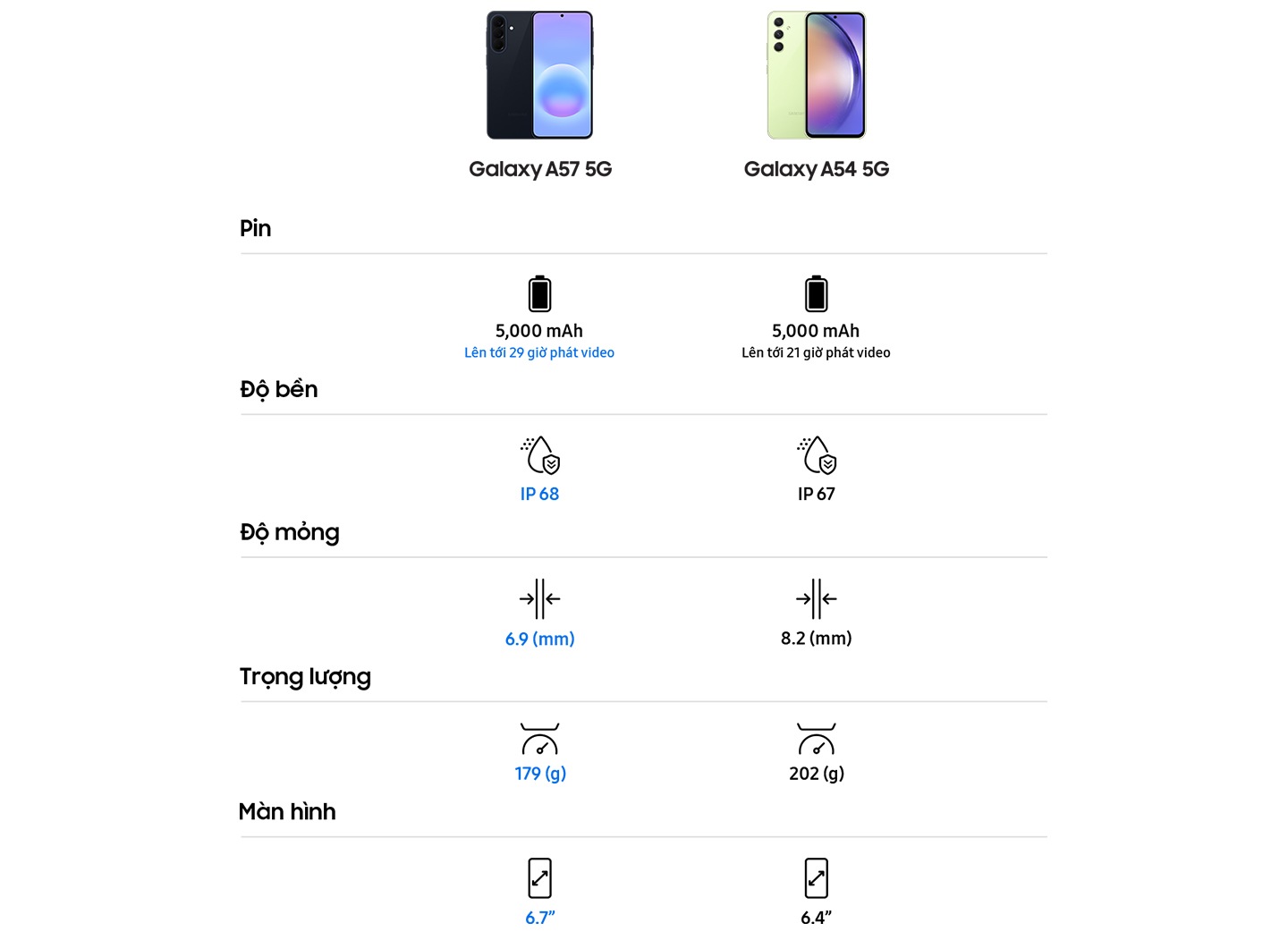 Tự hào giới thiệu Galaxy A57 5G – mỏng hơn, thời thượng hơn và Awesome hơn bao giờ hết. Dễ dàng tìm kiếm trực quan ngay trên màn hình với tính năng Khoanh Tròn Để Tìm Kiếm, hỗ trợ nâng tầm hiệu suất với các tính năng thông minh Awesome Intelligence như Xóa Vật Thể Thừa, Best Face Chân Dung Đẹp Nhất và Đề Xuất Chỉnh Sửa. Thỏa thích ghi lại khoảnh khắc đáng nhớ với cụm camera nâng cấp, cho hình ảnh sắc nét bất chấp ngày đêm, bất chấp điều kiện thiếu sáng. An tâm chinh phục trọn ngày dài với chuẩn kháng nước, kháng bụi IP68, cùng thời lượng pin bền bỉ lên đến 2 ngày. Đặc biệt, với 6 lần nâng cấp hệ điều hành và 6 năm cập nhật bảo mật, Galaxy A57 5G đảm bảo bạn luôn trải nghiệm công nghệ tiên tiến nhất!