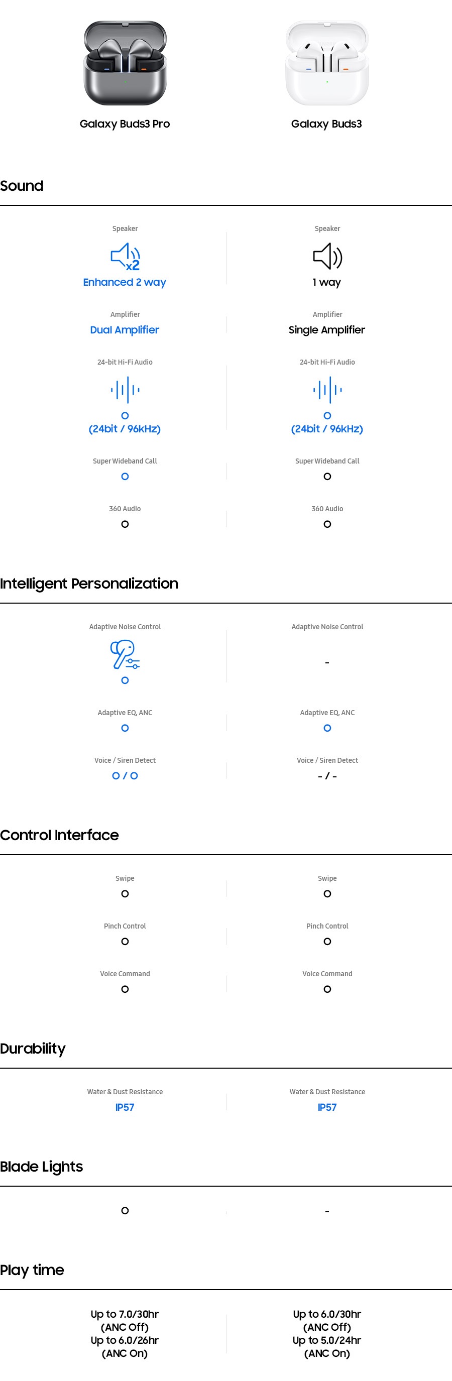 *Với tính năng ANC bật/tắt, tai nghe và hộp sạc cung cấp thời gian phát nhạc lên đến 30 giờ khi được sạc đầy. Dựa trên thử nghiệm nội bộ. Thời gian phát nhạc được kiểm tra bằng cách ghép nối Galaxy Buds3 phiên bản tiền sản xuất với điện thoại thông minh Galaxy mới phát hành gần đây với cài đặt mặc định. Thời lượng pin thực tế có thể thay đổi và phụ thuộc vào điều kiện sử dụng, cài đặt, số lần sạc, cường độ tín hiệu Bluetooth và các yếu tố khác. 'Thời gian phát nhạc' đề cập đến khi Galaxy Buds3 được kết nối với điện thoại, phát nhạc trực tuyến. Thời gian phát nhạc thực tế có thể thay đổi dựa trên cài đặt.