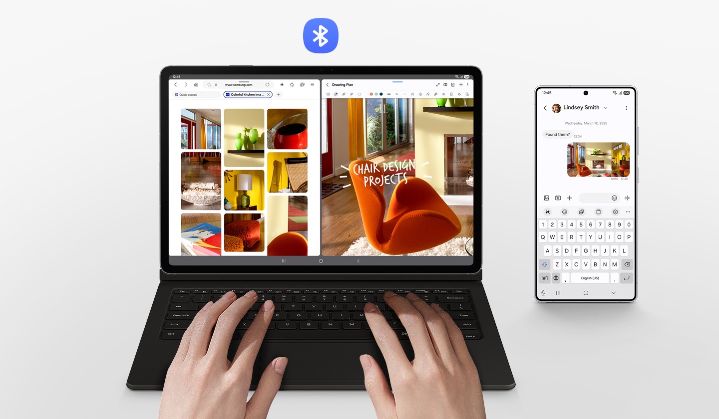 Với chia sẻ bàn phím không dây, bạn có thể dễ dàng kết nối với các thiết bị Galaxy khác của mình và gõ trơn tru và thao tác trên bàn phím. Chuyển đổi giữa các thiết bị một cách dễ dàng và kiểm soát điện thoại của bạn như trên máy tính bảng của bạn.5