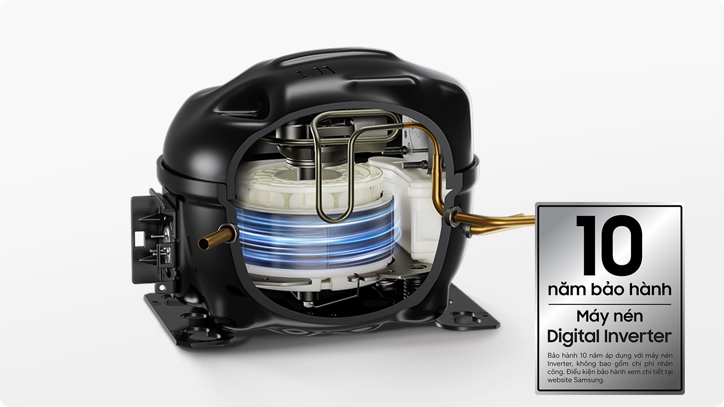 Máy nén biến tần kỹ thuật số Digital Inverter tự động điều chỉnh tốc độ vận hành tùy theo nhu cầu làm lạnh. Nhờ đó, tủ lạnh tiết kiệm điện năng tốt hơn, giảm thiểu tiếng ồn và hạn chế hao mòn động cơ để kéo dài tuổi thọ máy, đồng thời được bảo hành đến 10 năm*.